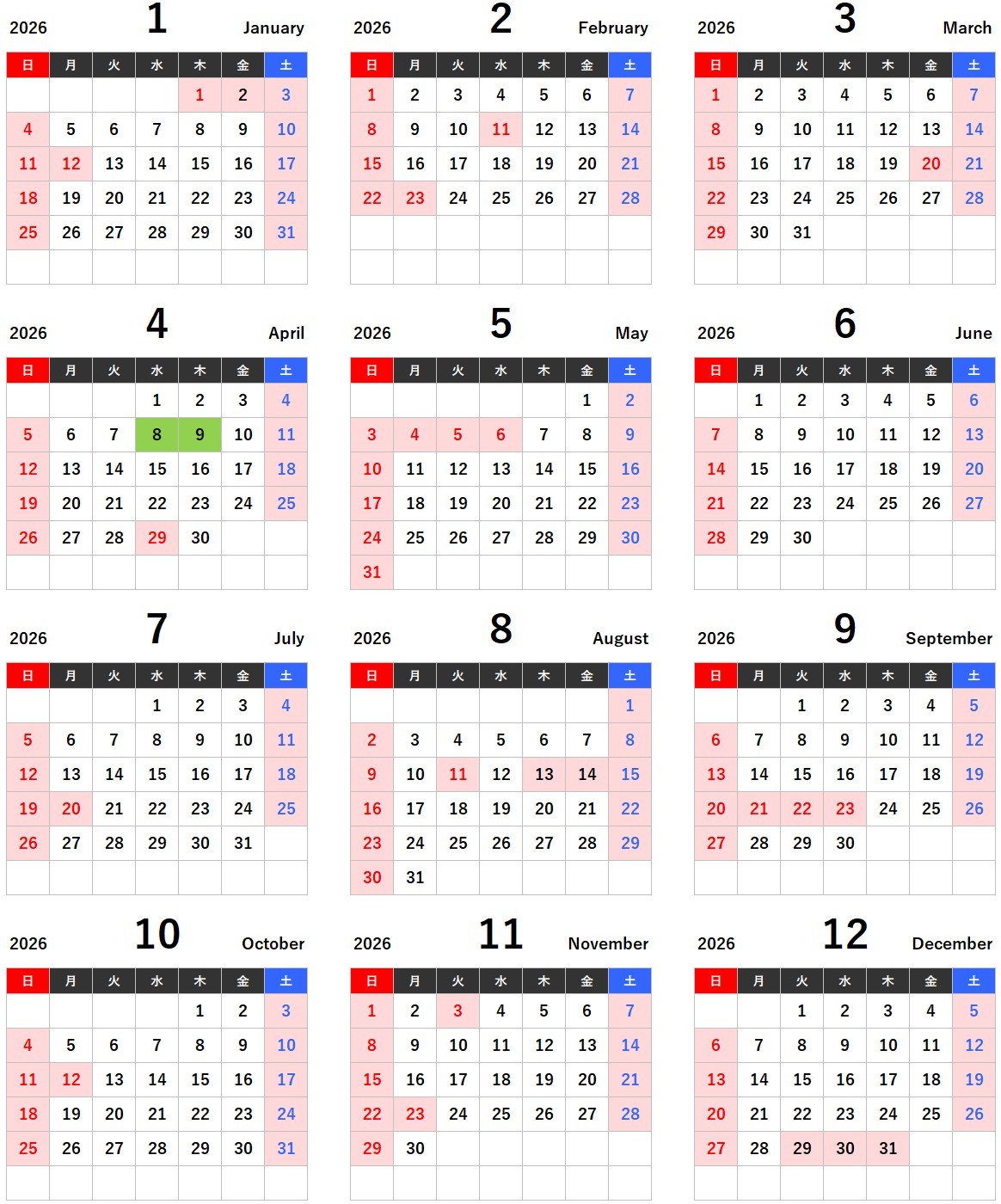 2026営業日カレンダー