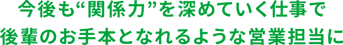 自身のキャリアとしても、会社の中心として周囲を引っ張っていかなければならない立場になります。お客様とは引き続きより良い関係構築に努め、社内では上司に信頼され、後輩からも慕われるような社員になることが目標です。
