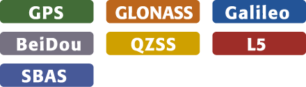 GPS はL1、L2に加えL5を受信でき、GLONASS、QZSS、BeiDou、GalileoそしてSBASも利用可能です。また、448のチャンネル数に対応することで、今後増加傾向にある衛星数にも余裕を持って対応することができます。
